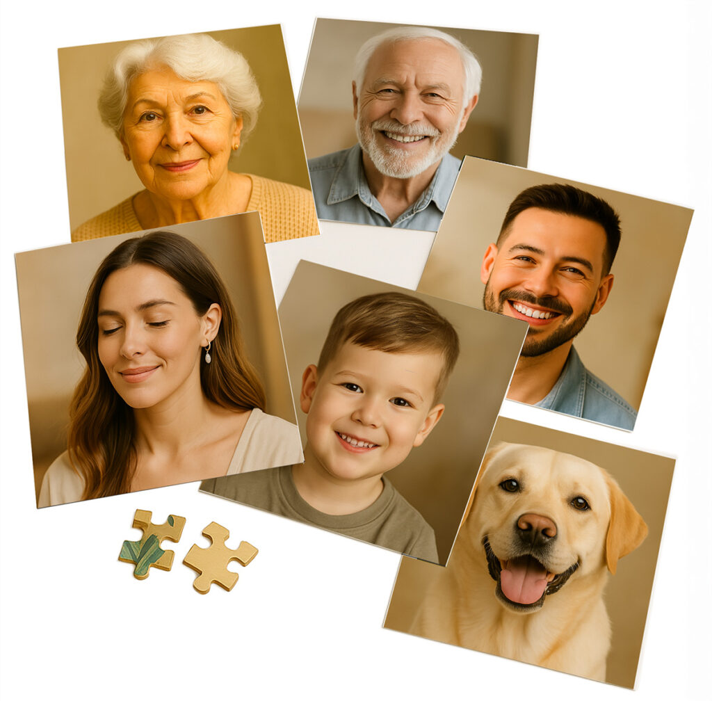 Dus of het nu gaat om opa, oma, papa, mama, Tim of labrador Fifo, deze puzzel laat ze allemaal terugkomen in één slim vormgegeven object. Een mooie herinnering, een verrassend cadeau of een speelse toevoeging aan je interieur.